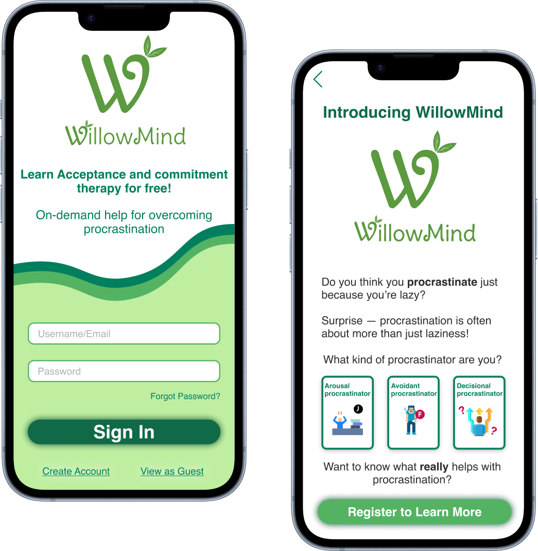 WillowMind is grounded in Acceptance and Commitment Therapy (ACT) and designed to help students manage and overcome academic procrastination.